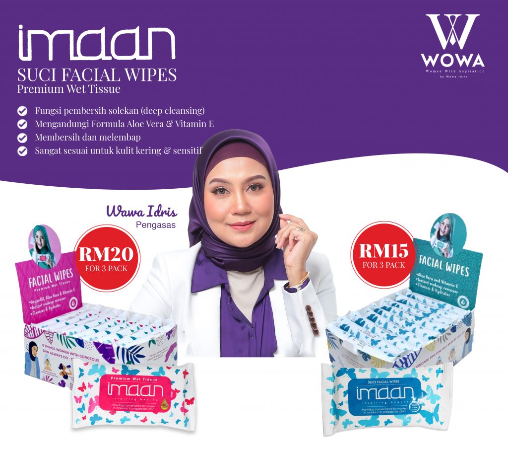 Imaan Suci Facial Wipes memberi Memberi kemudahan untuk wanita dalam solek untuk bersiap sedia sholat.