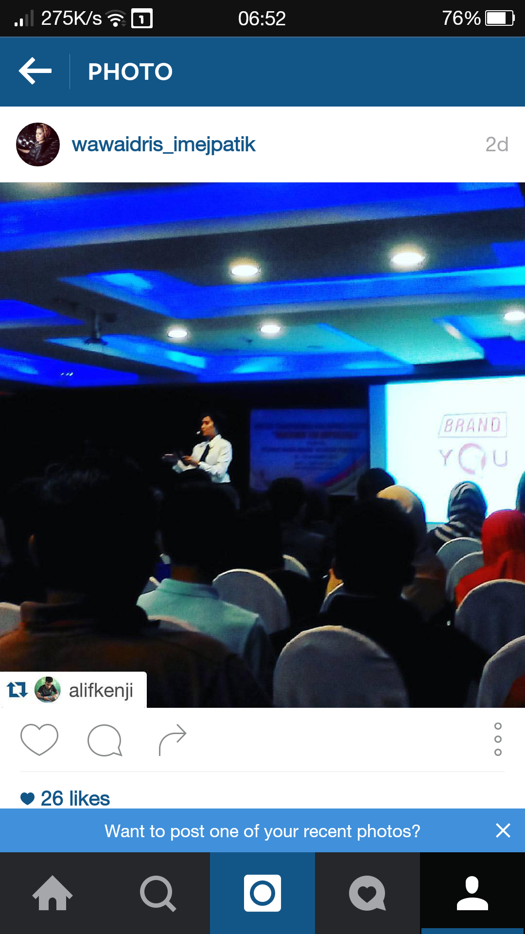 Memandangkan kebanyakannya adalah usahawan, maka patik memilih tajuk Brand You. Seperti yang patik katakan, ramai trainer mengajar bagaimana nak menjual produk, tetapi kepakaran patik adalah ‘menjual orang’. Riuh dewan apabila patik berkata begitu.